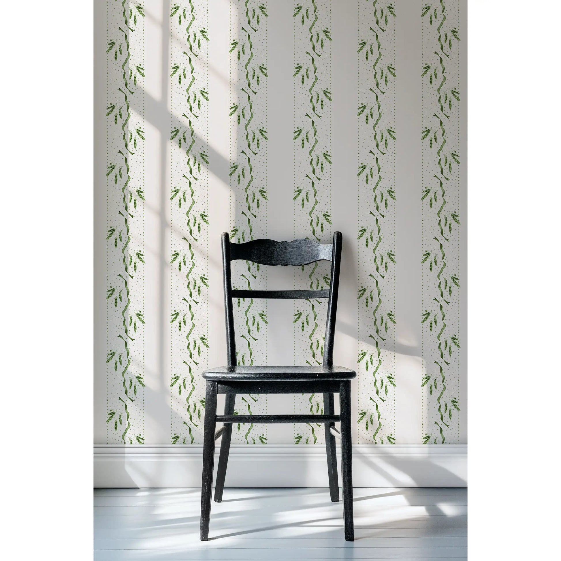 'Peas Please!' is a beautiful wallpaper illustrating pirouetting ribbons twisting their way through the sweetest of sweet peas, in a glorious pea green colour way. A design that is as elegant, as it is utterly charming!